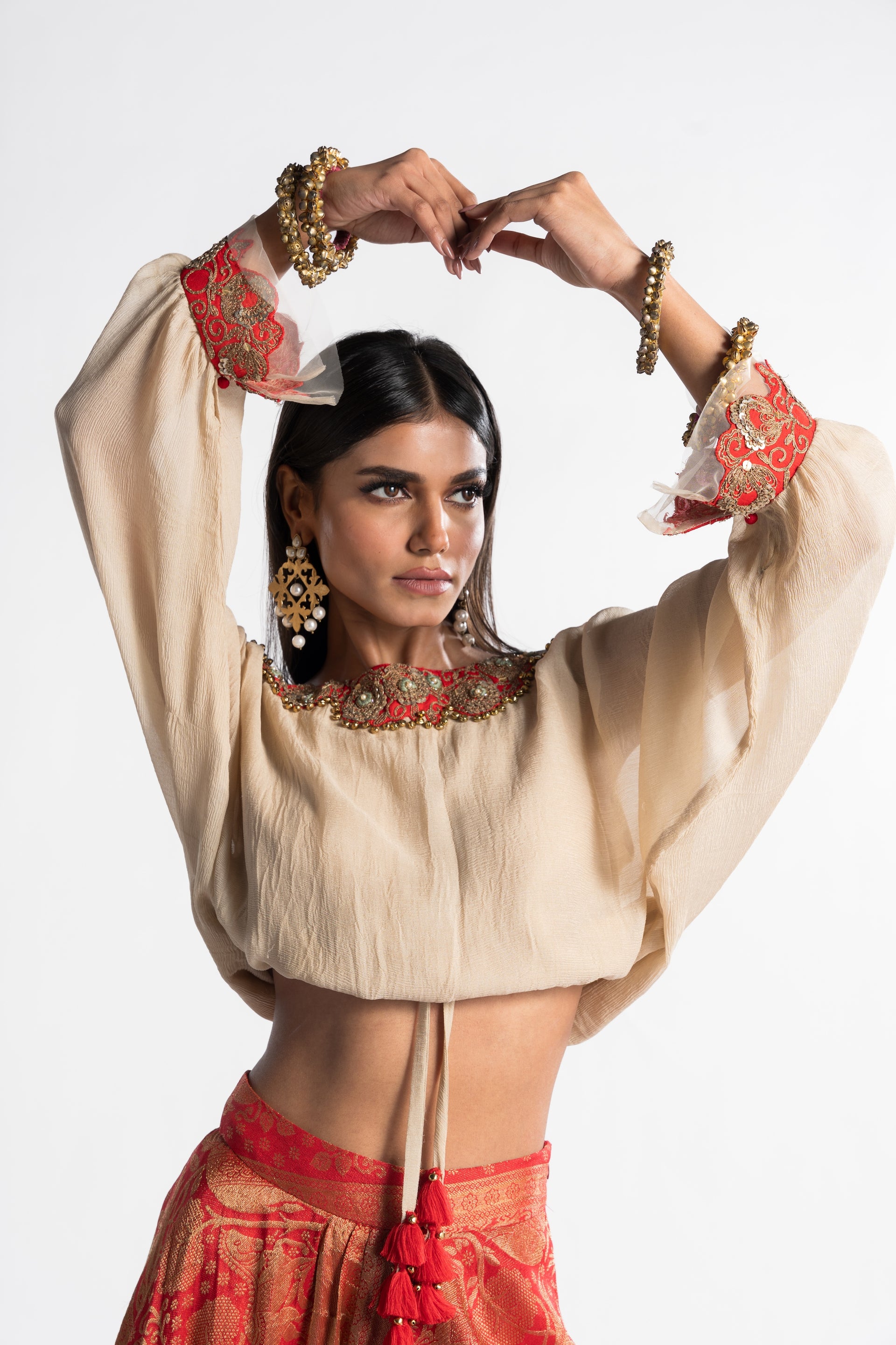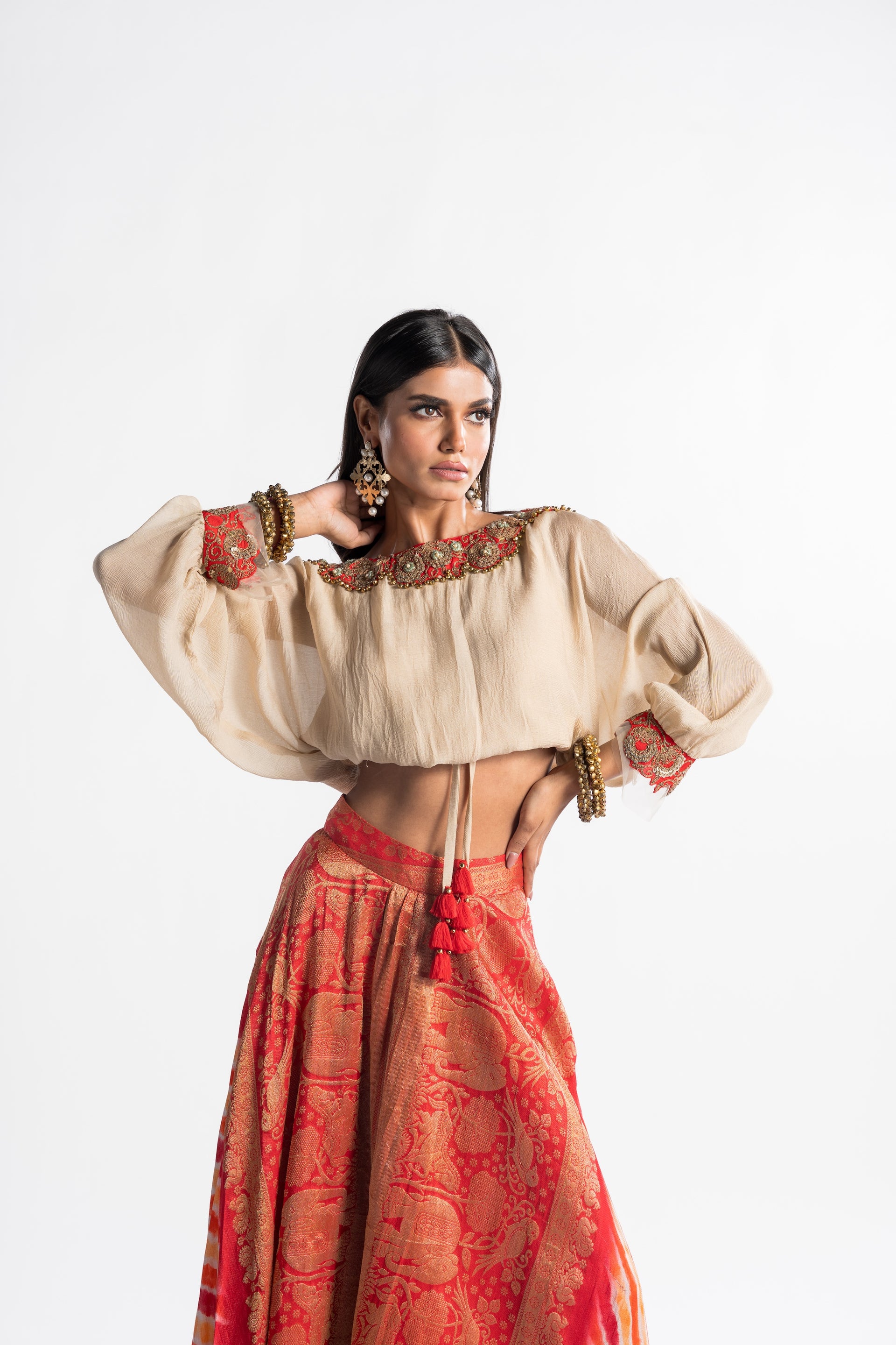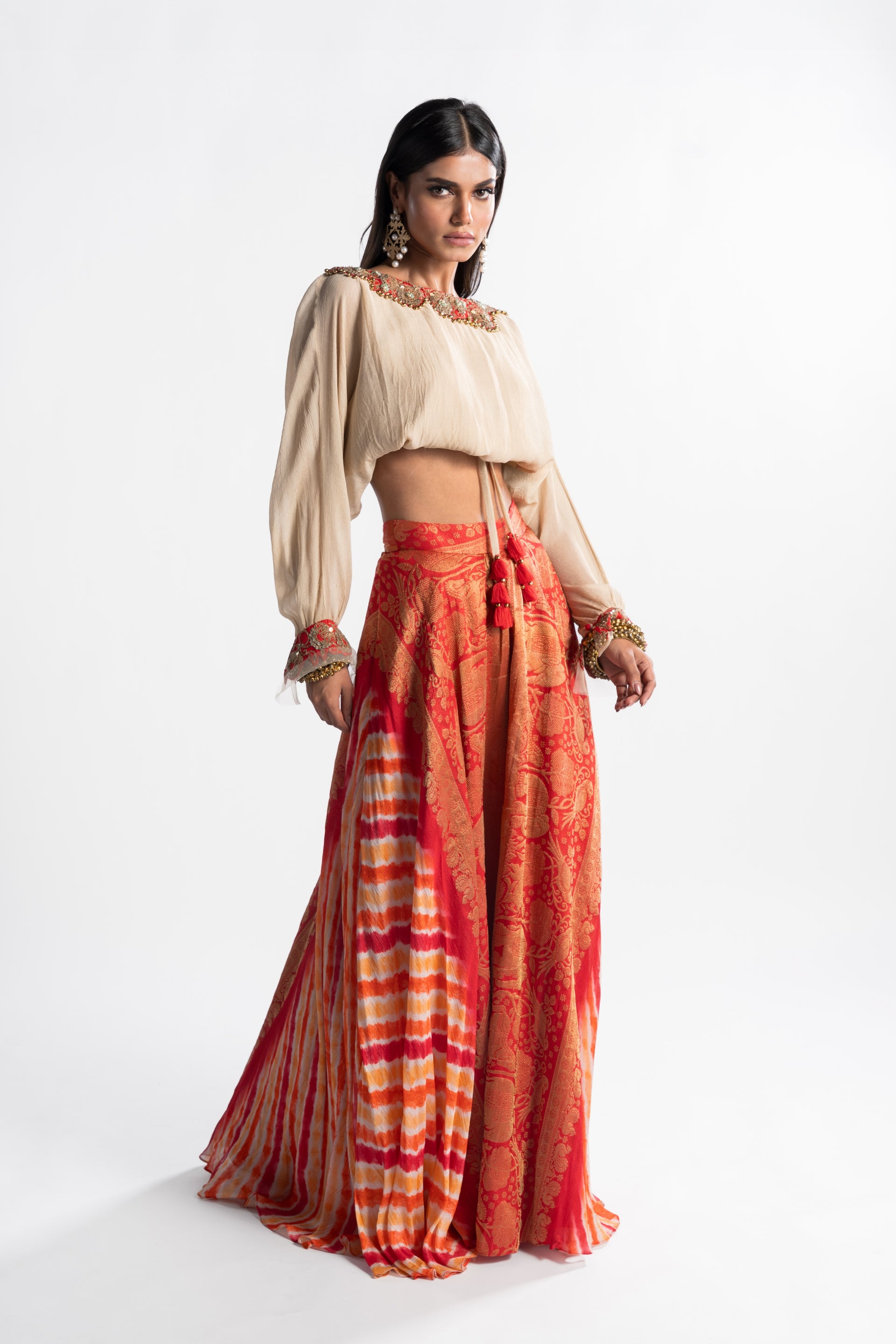 The Zaina Balloon Sleeves Top and Draped Skirt pairs a delicate champagne chiffon top with a vibrant brocade skirt. Bold contrasts and voluminous sleeves blend elegance with playful color, perfect for festive occasions.