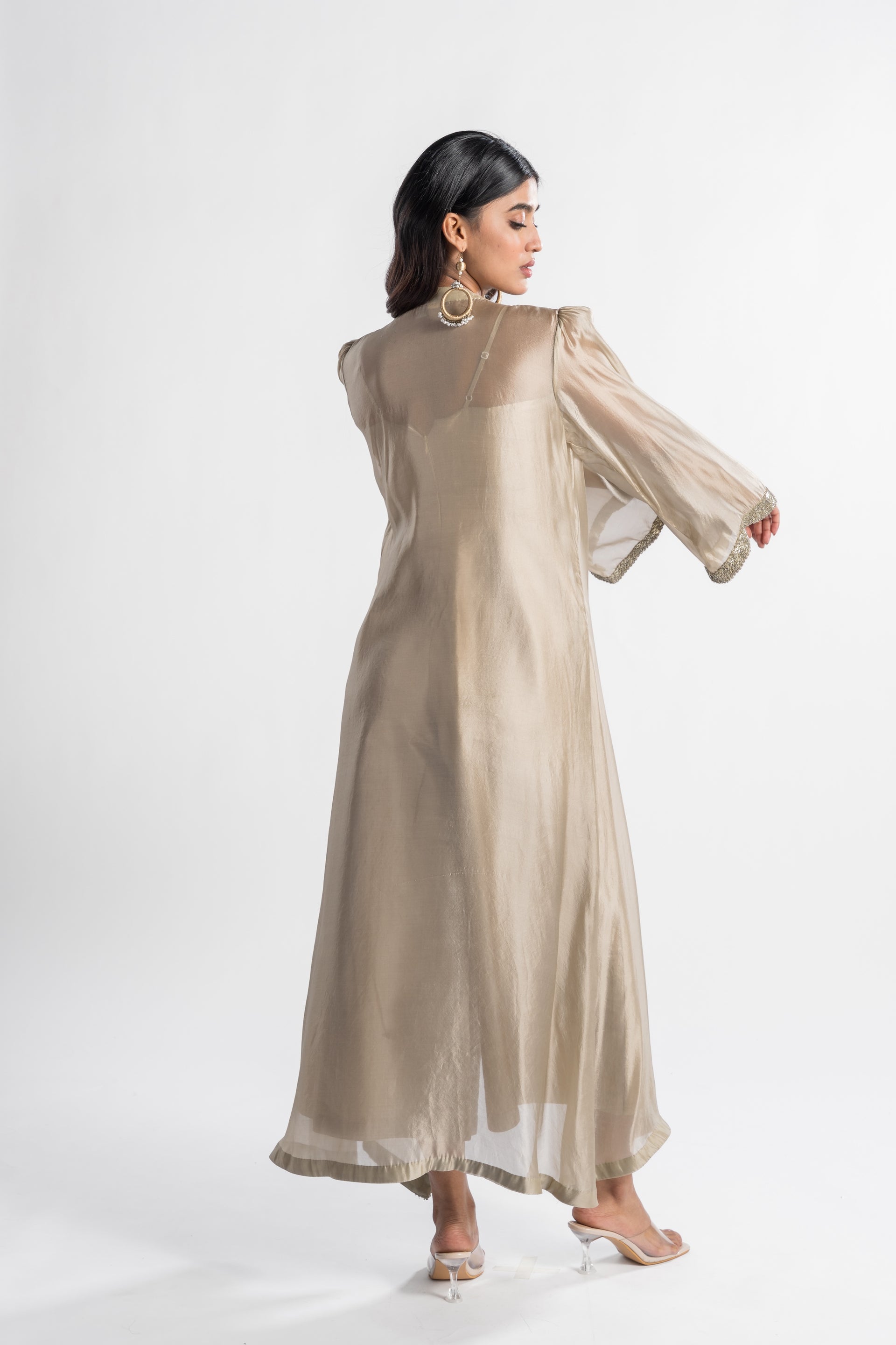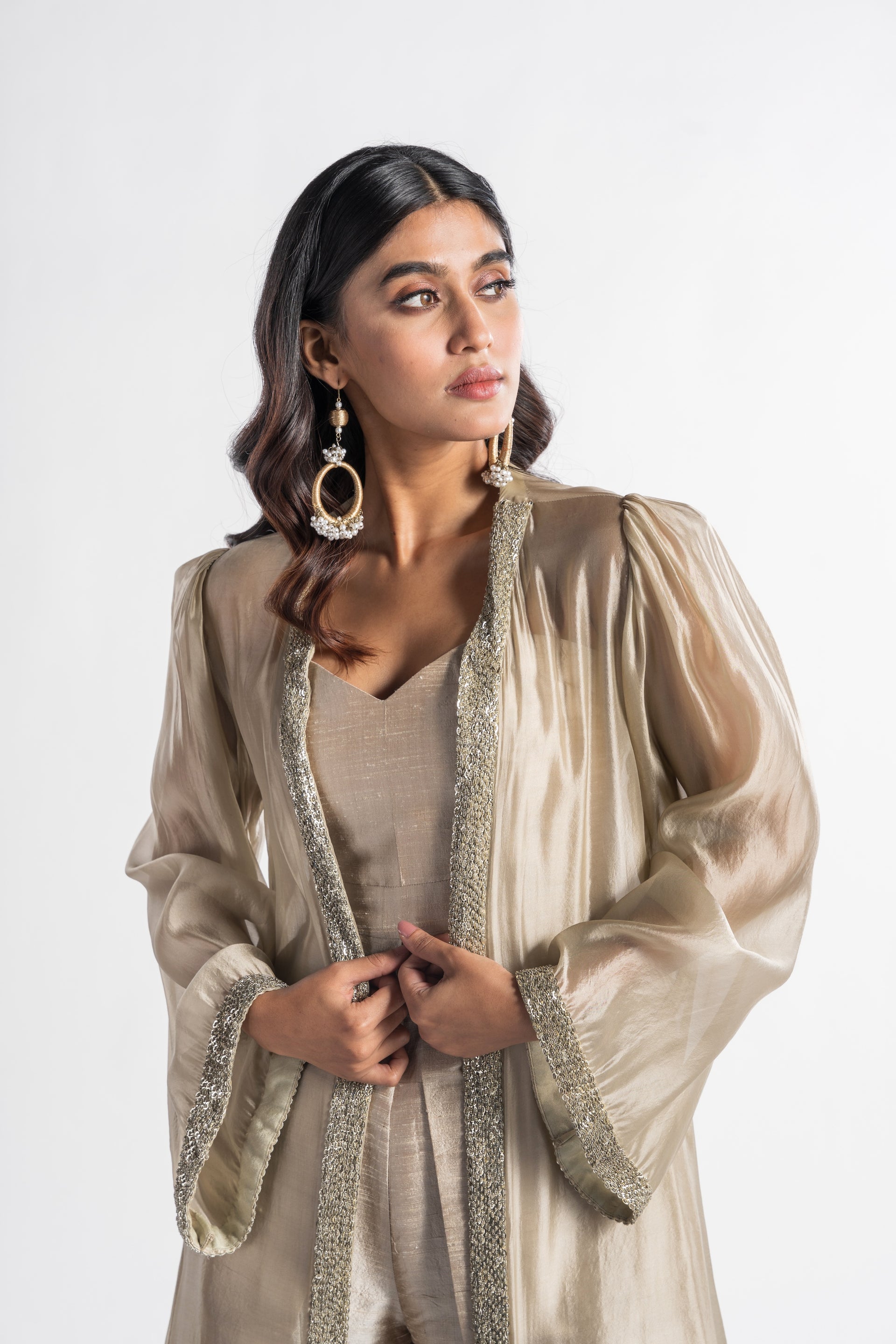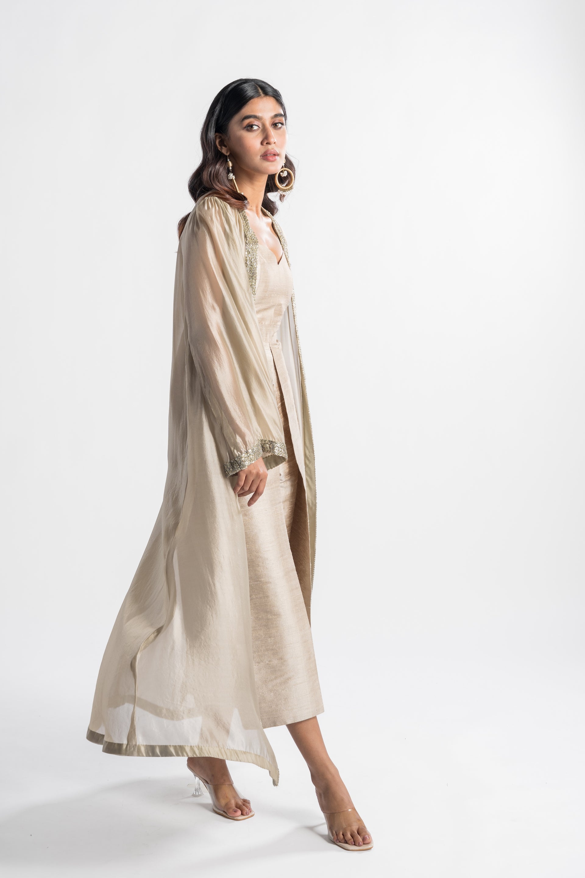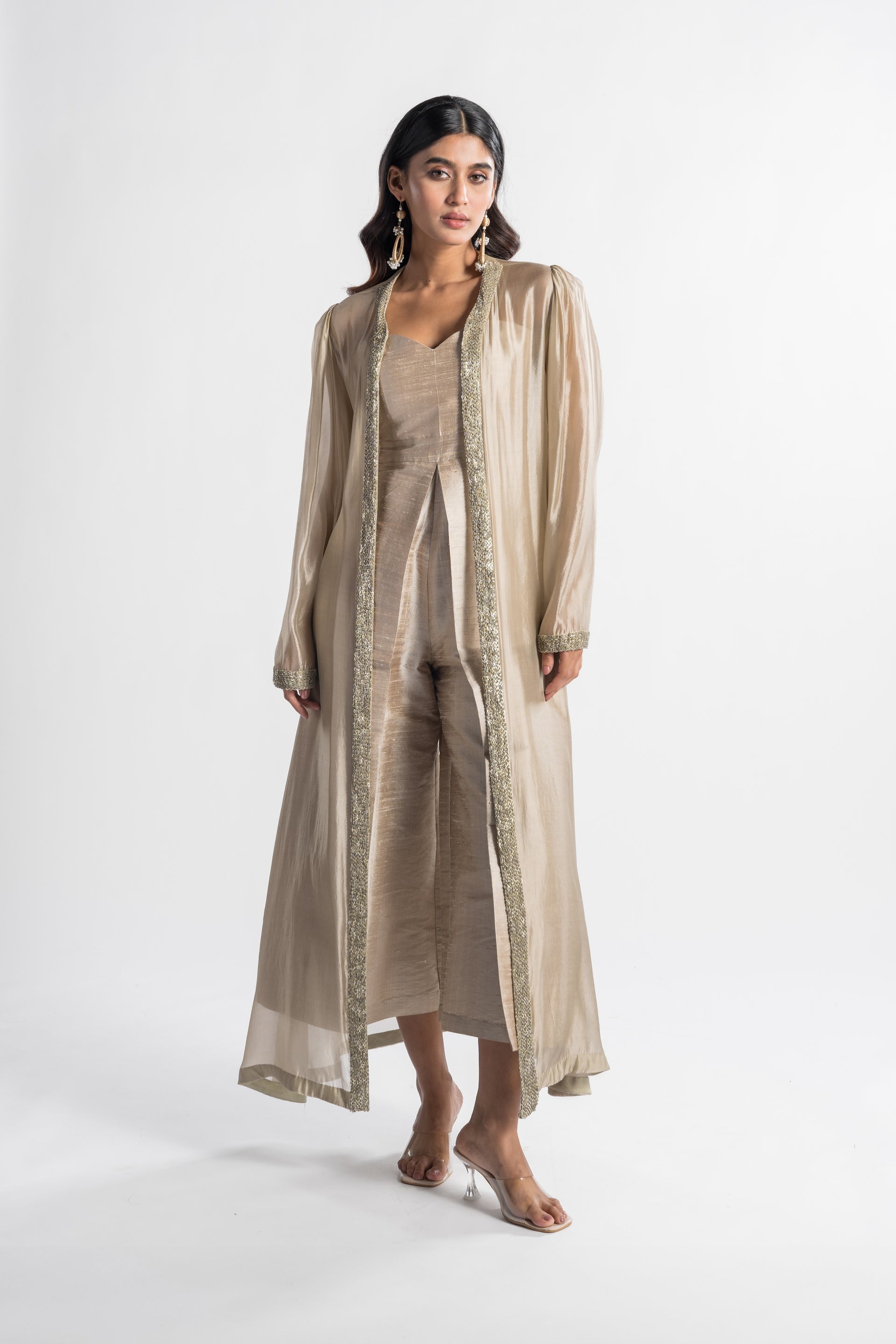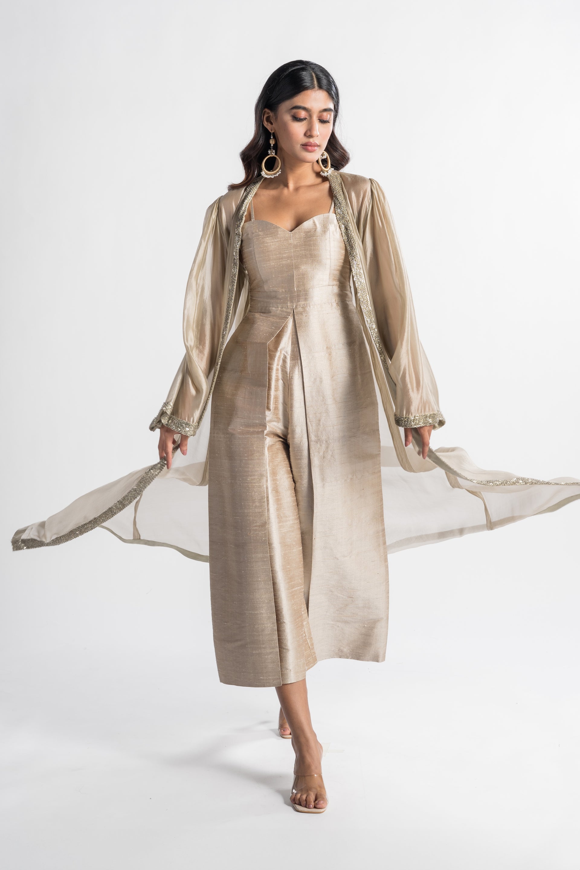 The Zeenat Champagne Jumpsuit features a sleek palazzo silhouette in a soft champagne hue, complemented by a flowing cape that adds a traditional touch. This modern and versatile piece embodies classic sophistication, making it an ideal choice for special events.