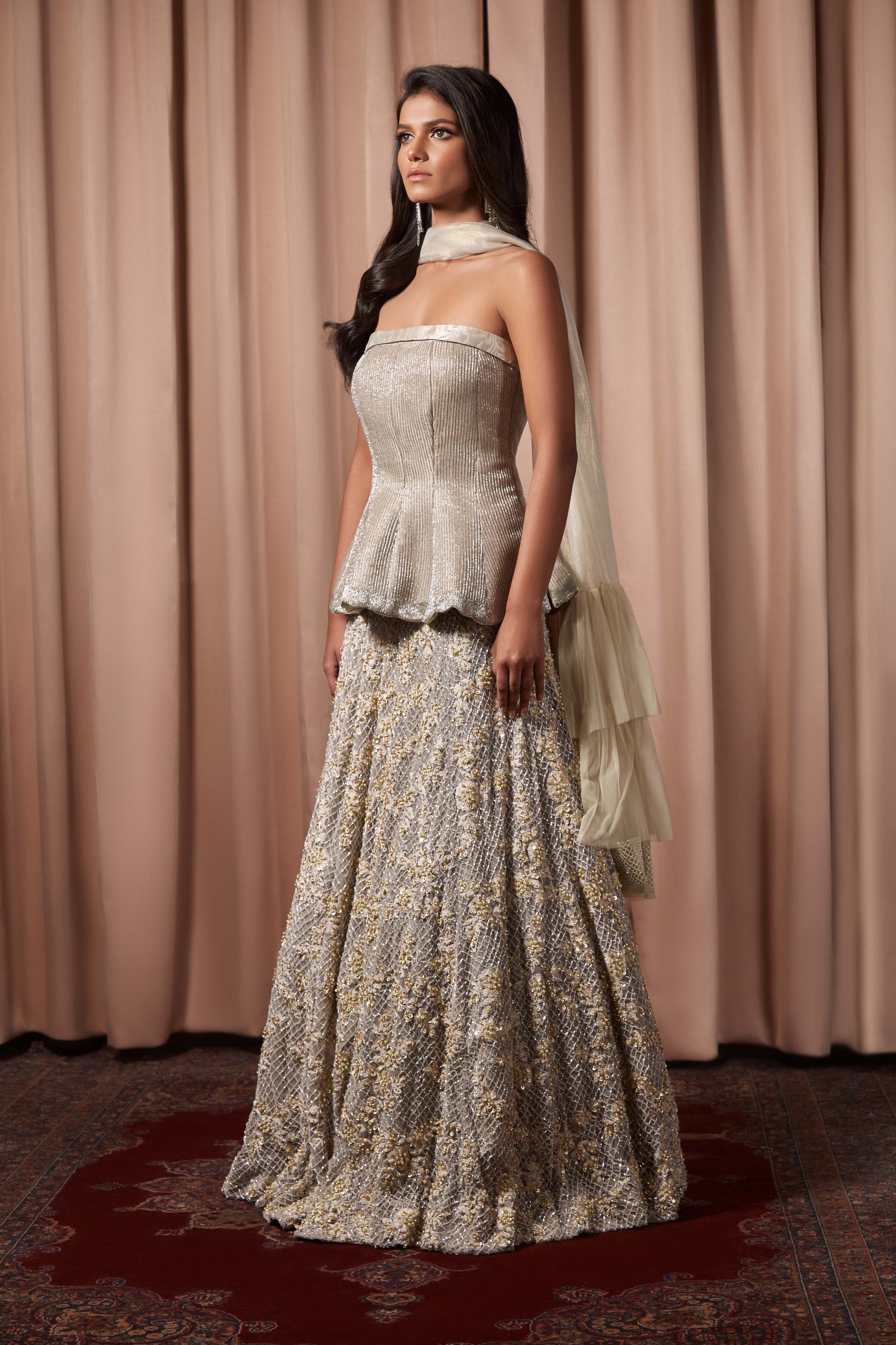 Fabric : Peplum - Dupion Silk, Lehenga - Satin & Georgette, Dupatta - Organza Tulle